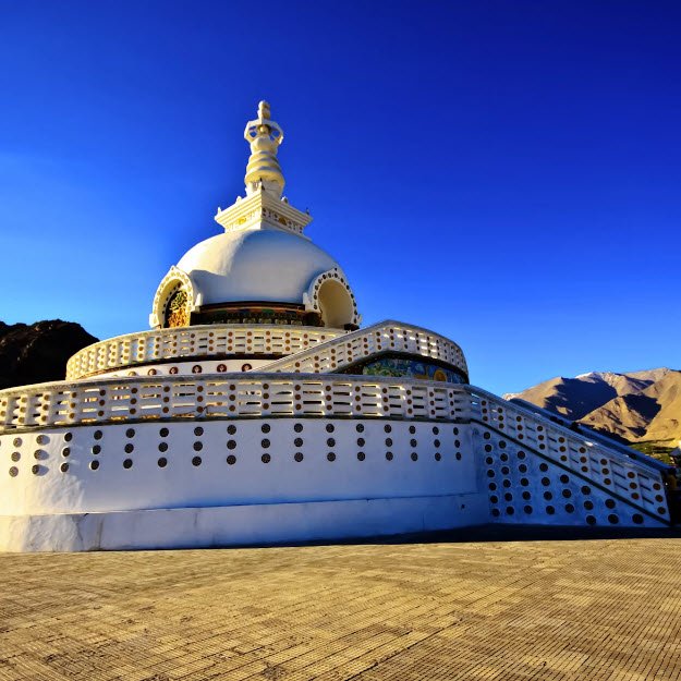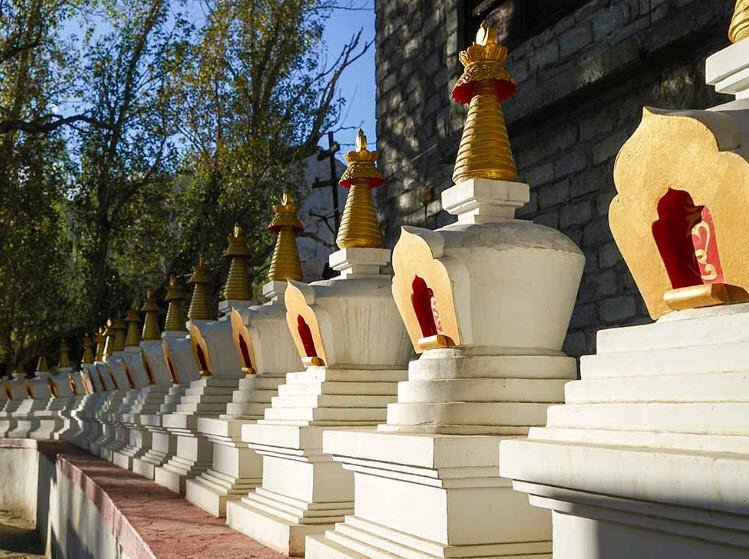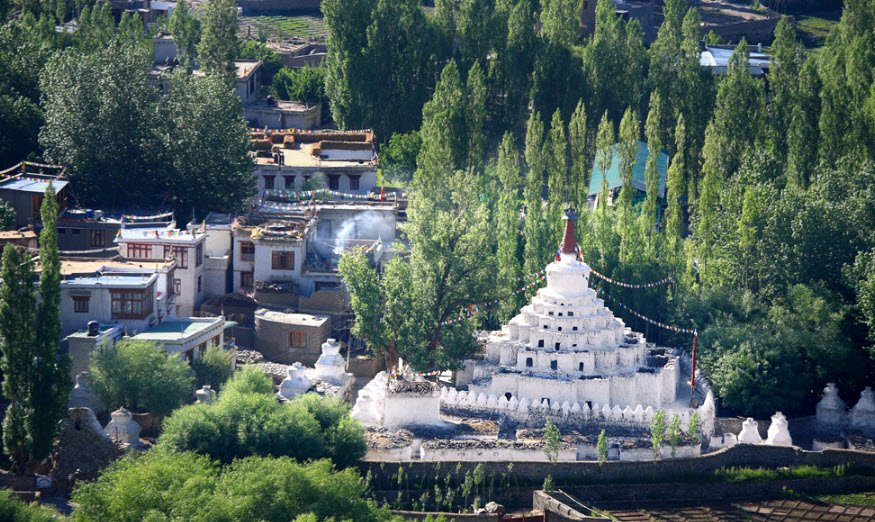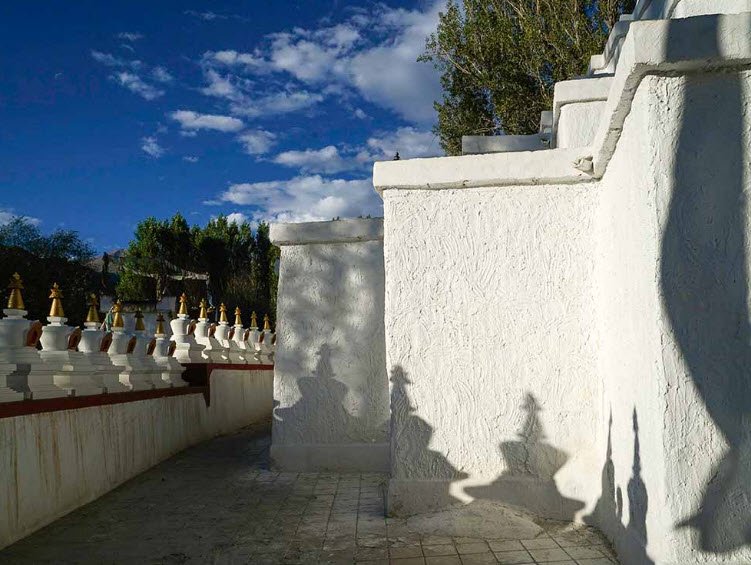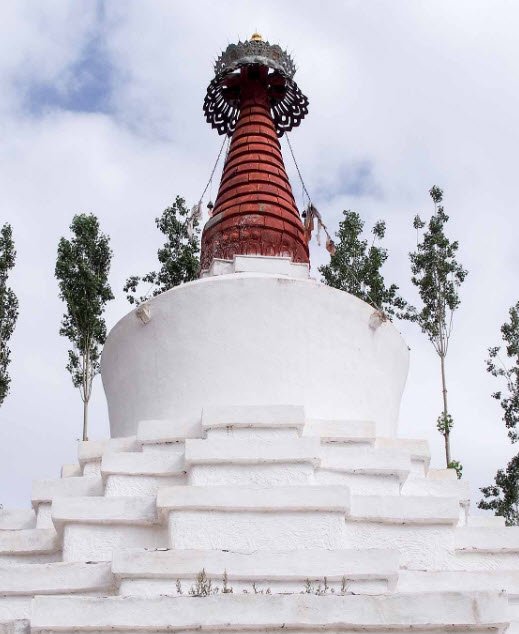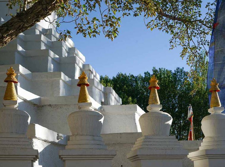 This large 9th-century whitewashed stupa rises in concentric serrated layers flanked by numerous chortens. The charming, shady setting retains a refreshingly spiritual atmosphere and there are several carved stones nearby, including one life-sized Buddha standing beneath a concrete shelter to the north.