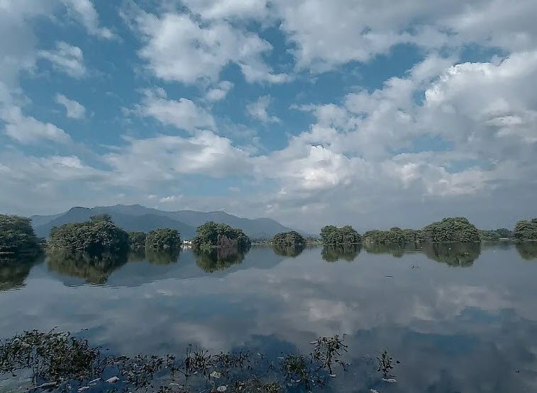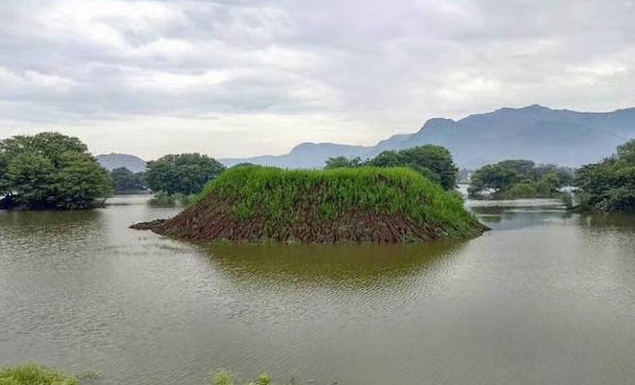 The lake features 47 man-made islands, each created by excavating and piling lakebed clay about 10 feet high. Initially, millet was planted on the islands to arrest erosion and help build a soil layer before saplings of neem, banyan, jambul, peepal, and vetiver trees could be planted. The lake islands are now populated by nearly 12,000 trees.