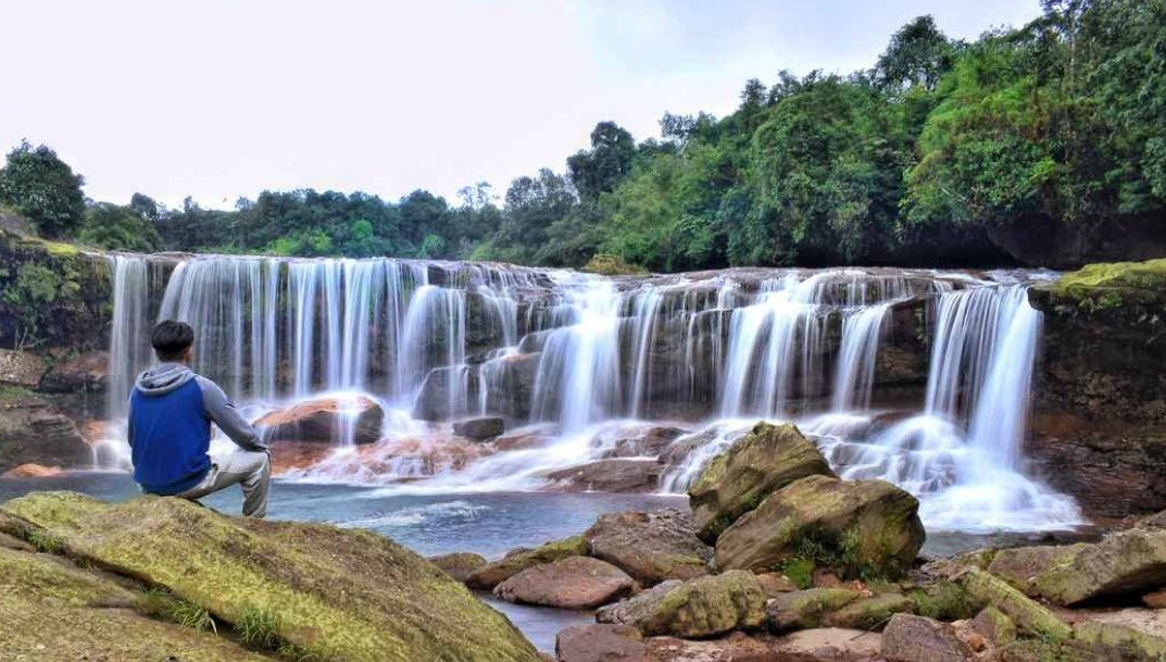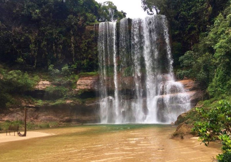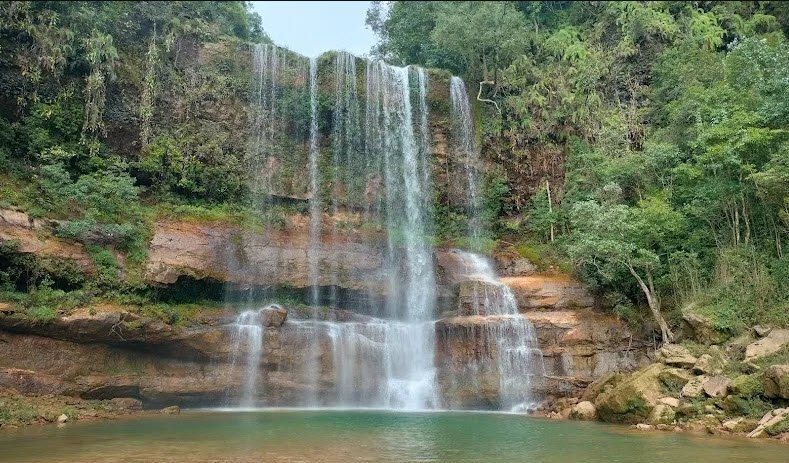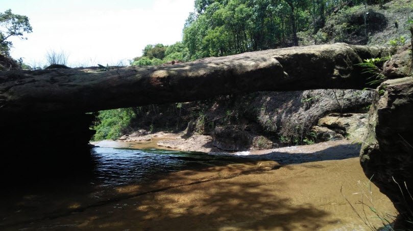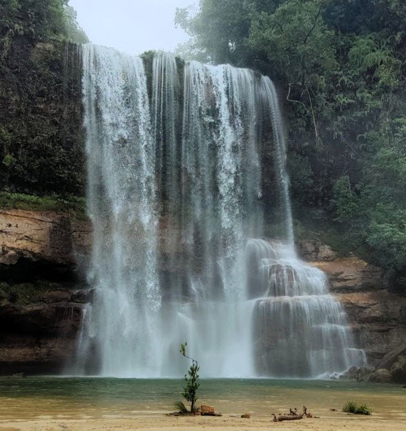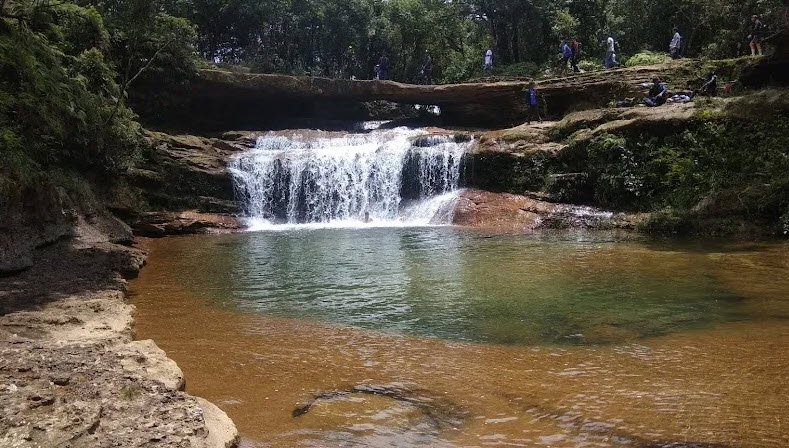 Moopun Falls, also known as Moopun Waterfalls, is a stunning waterfall located along the Umjhai River in the East Jaintia Hills district of Meghalaya. The falls drop from a height of 110 feet and spread 50 feet wide, creating a beautiful cascade that flows into crystal-clear waters on a sandy beach below. One unique feature of Moopun Falls is the Stone Bridge that connects both sides of the Umjhai River just above the waterfall.