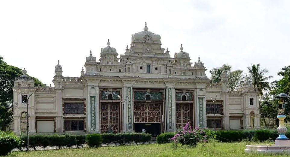 The Rajendra Vilas Palace, also known as Rajendra Vilas, is a historical palace located atop Chamundi Hills in Mysuru, Karnataka. Originally built as a summer palace for the Wodeyars of Mysore, it was commissioned by Maharaja Krishnaraja Wodeyar IV and completed between 1938 and 1939. The palace is designed in the Indo-Saracenic style, featuring beautiful arches, domes, and chhatris (elevated, enclosed pavilions).