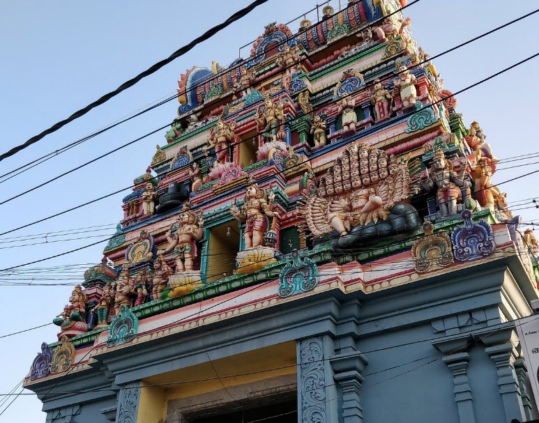 The temple's architecture features a three-tiered rajagopuram (main entrance tower) and a Thirukulam (sacred tank) in front of the temple. Inside the temple complex, you will find the Dwajasthambam (flagstaff), Palipedam (altar), and Nandi (the sacred bull) positioned after the rajagopuram.